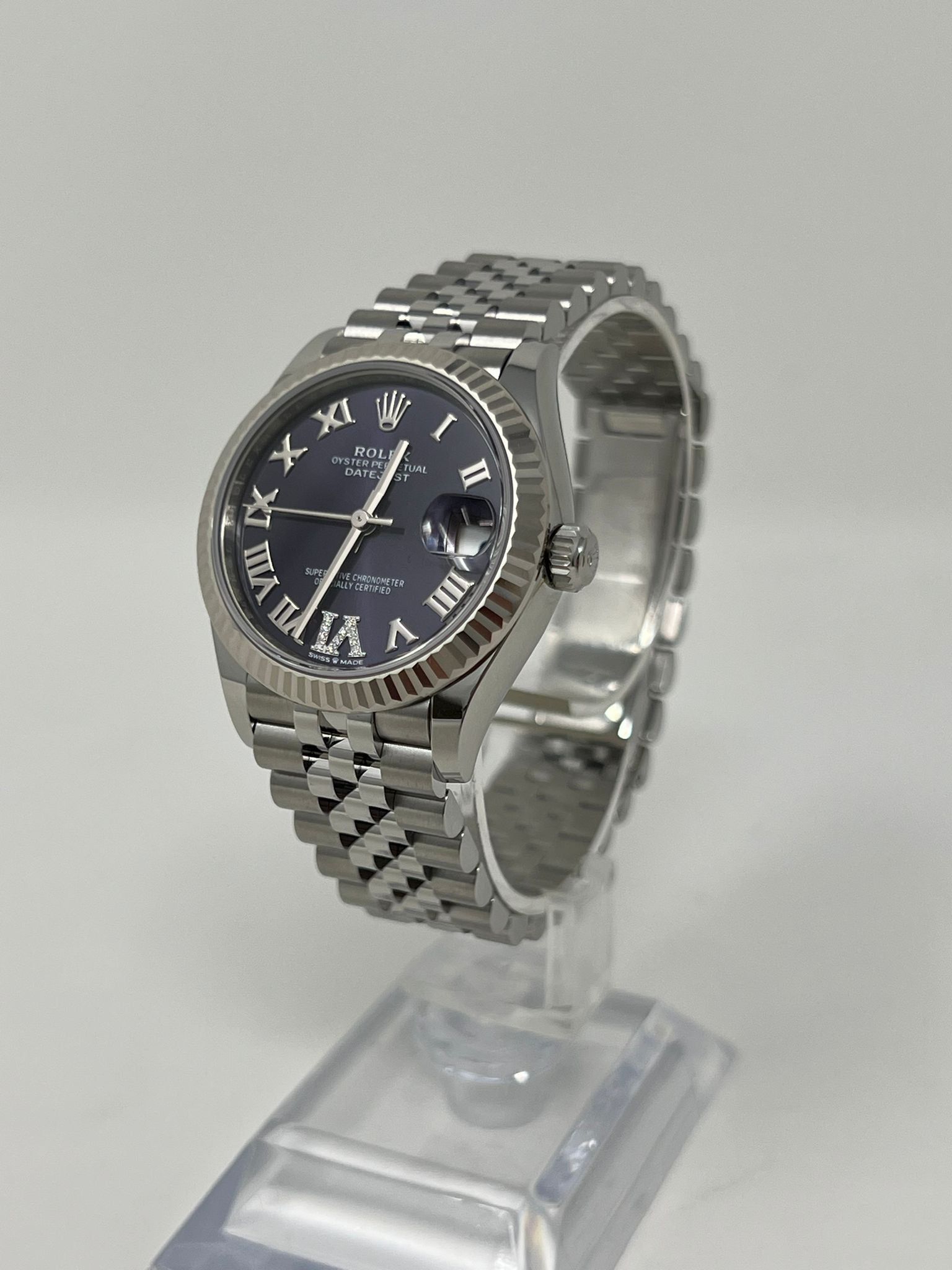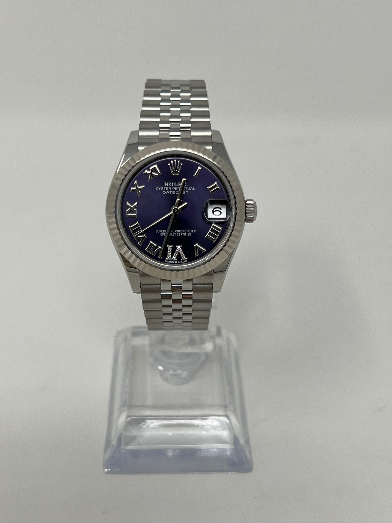 31mm white Rolesor case comprised of Oystersteel and 18K white gold, screw-down back, screw-down crown with twinlock double waterproofness system, 18K white gold fluted bezel, scratch-resistant sapphire crystal with cyclops lens over the date, aubergine dial, Roman numerals with diamond set 6, Rolex calibre 2236 perpetual self-winding movement with date at 3 o'clock, approximately 55 hours of power reserve, Oystersteel Jubilee bracelet with five-piece links, concealed folding Crownclasp buckle. Waterproof to 100 meters.